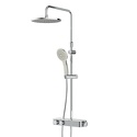Устройство: душевая система • Смеситель: термостатический, с кнопкой • Ручная лейка: размер 120 мм, настройки 3 шт • Верхний душ: размер 250 мм, настройки 1 шт • Комплектация: ручной душ, смеситель, стойка, шланг, крепление ручного душа, полка