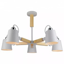 оригинальный светильник, который по достоинству оценят любители современных и уютных интерьеров. в осветительном устройстве удачно сочетаются конструктивные элементы из дерева и металла. каждый из 5 плафонов в виде усеченного конуса имеет боковое крепление к рожку оснащённое шарнирным узлом. данное решение позволяет изменять направление потока света для каждого источника отдельно. общий цвет люстры белый, который органично будет смотреться в любом помещении.