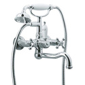 Назначение: ванна+душ • Конструкция: двухрычажный • Монтаж: вертикальный • Материал: покрытие - хром • Подводка: жесткая • Монтажные отверстия: 2 отверстия • Форма излива: традиционная • Душевая лейка в комплекте: есть • Держатель для душевой лейки: на смесителе