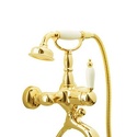 Назначение: ванна+душ • Конструкция: однорычажный • Монтаж: вертикальный • Материал: покрытие - золото • Подводка: жесткая • Монтажные отверстия: 2 отверстия • Форма излива: традиционная • Душевая лейка в комплекте: есть • Держатель для душевой лейки: на смесителе