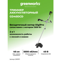 Триммер аккумуляторный Greenworks 40 вольт (модель GD40BCB) - отличная замена электро или бензиновому триммеру, он с легкостью справиться с высокой травой, а благодаря режущему диску (в комплекте) можно резать крупный кустарник. Это полупрофессиональный триммер, который отлично подойдет для ведения дачного хозяйства. Модель оснащена надежным бесщеточным двигателем DigiPro, сопоставимым по мощности с бензиновыми аналогами, при этом он абсолютно экологичен, имеет высокий крутящий момент, низкий уровень шума и
